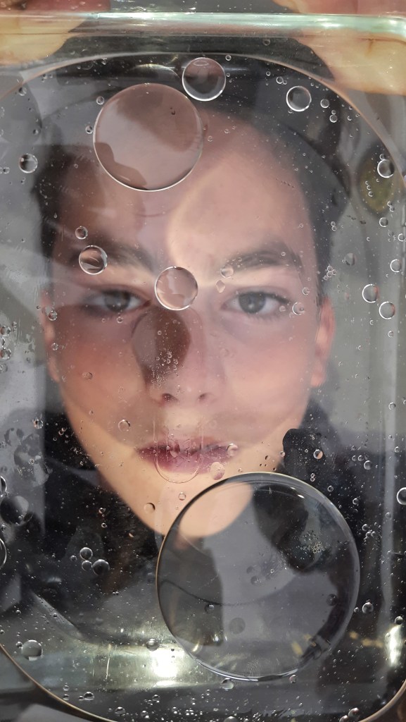 Students had two choices; 1. to photograph people of objects through a glass tray of water with floating bubbles. 2. to blow bubbles and see their relationships in their environment.