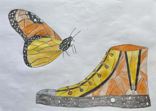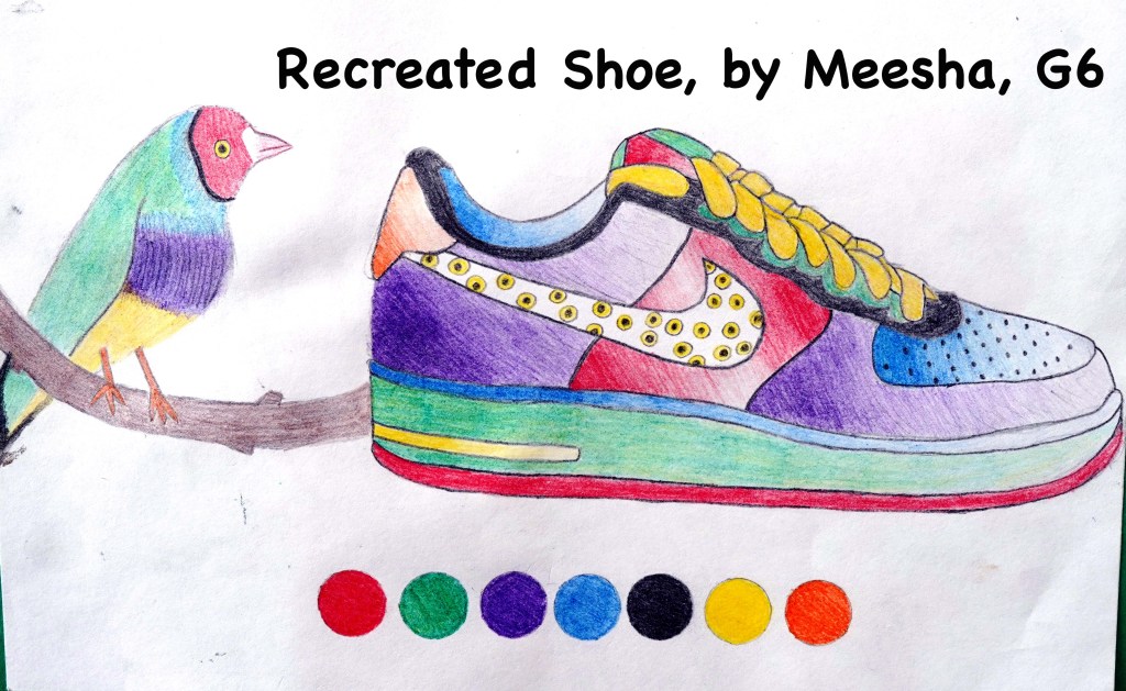 In this unit students were challenged with both observational drawing and creative problem solving. Being that we live in South Africa, I asked the students to identify a bird, insect, lizard or fish from this area of the world. It had to have colour, pattern and/or textures. They were then asked to think like a designer and to recreate their shoe’s design using the animal they chose.