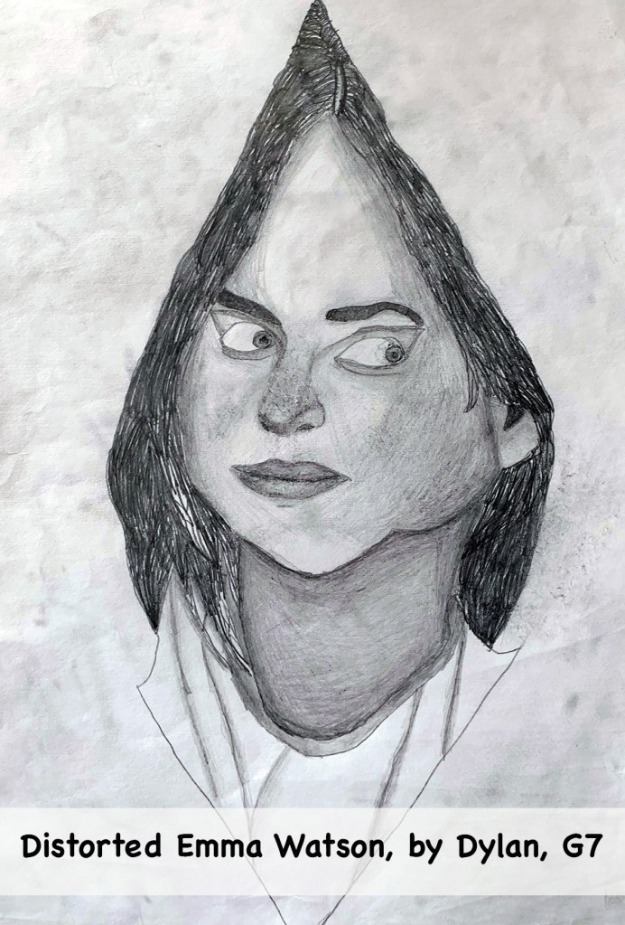 In this unit, I taught students how to draw a distorted grid. I then asked them to draw a normal grid over a portrait they had printed. Using the grid drawing format, the students had to draw their portraits within the grid, even as it distorted.