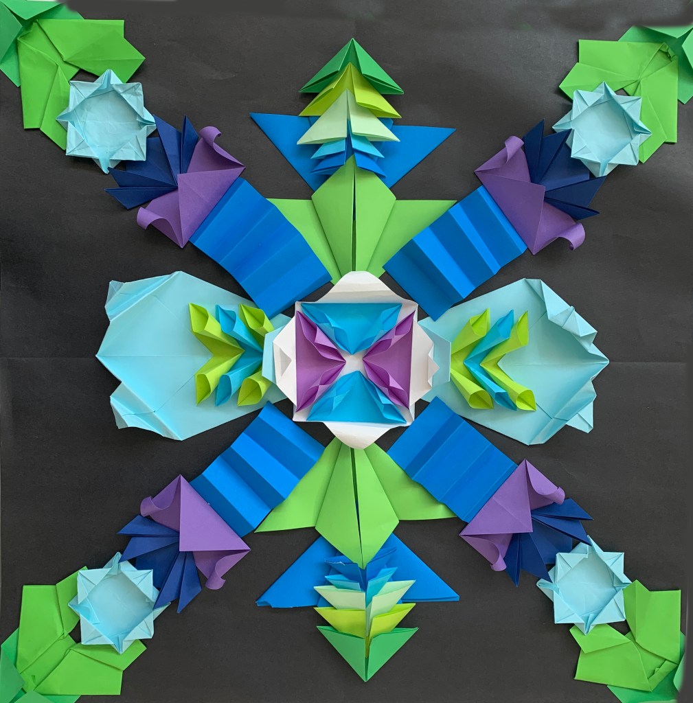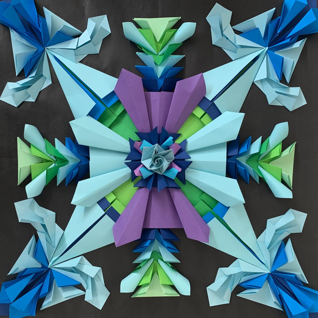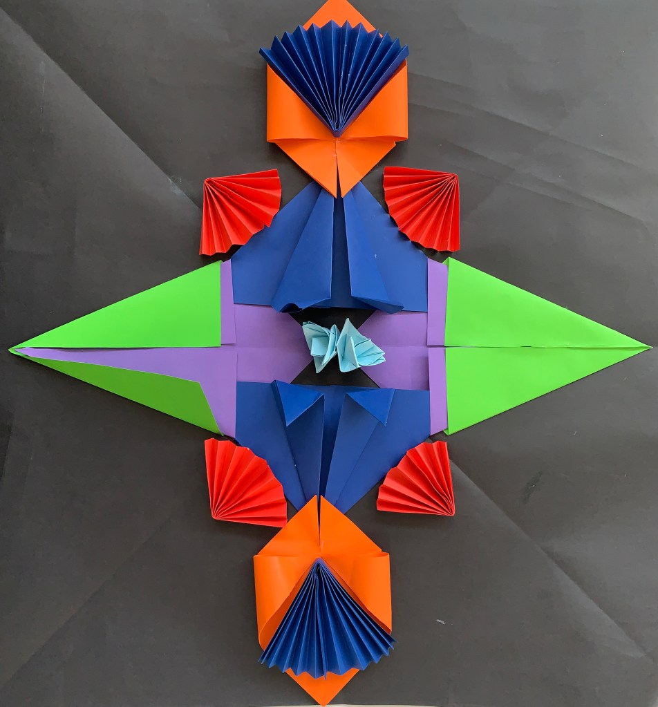 In this unit, students used the Japanese origami paper folding technique and following colour harmonies, created radial designs inspired by Mexican Mandalas. By mixing the two cultures, students came to understand the designs of one culture, using the techniques of another.