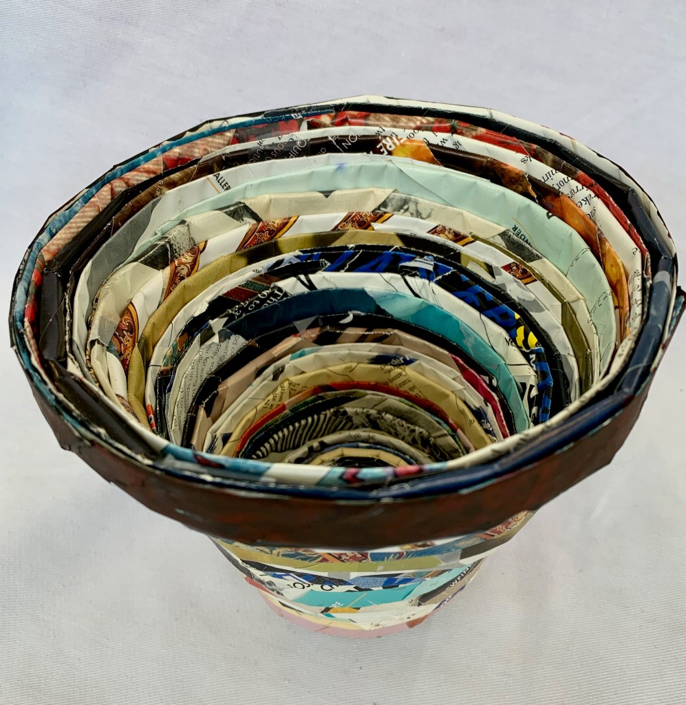 I was teaching a sculpture class while under Covid 19 Lockdown. I was faced with the challenge of how to teach a sculpture class remotely. I developed units based on materials students had in their homes. In this unit, I asked students to rip pages from magazines from home and to follow my directions in order to use them to sculpt a bowl.