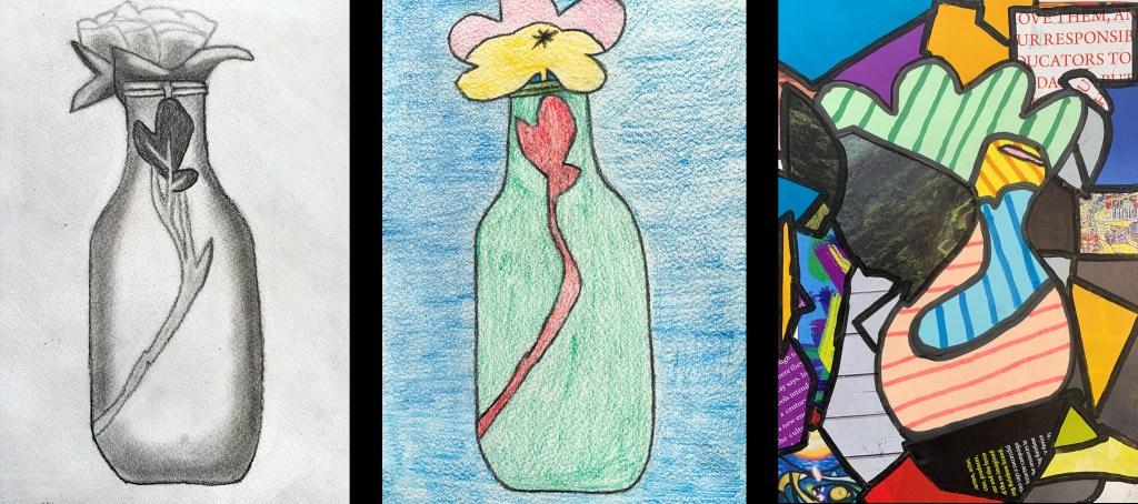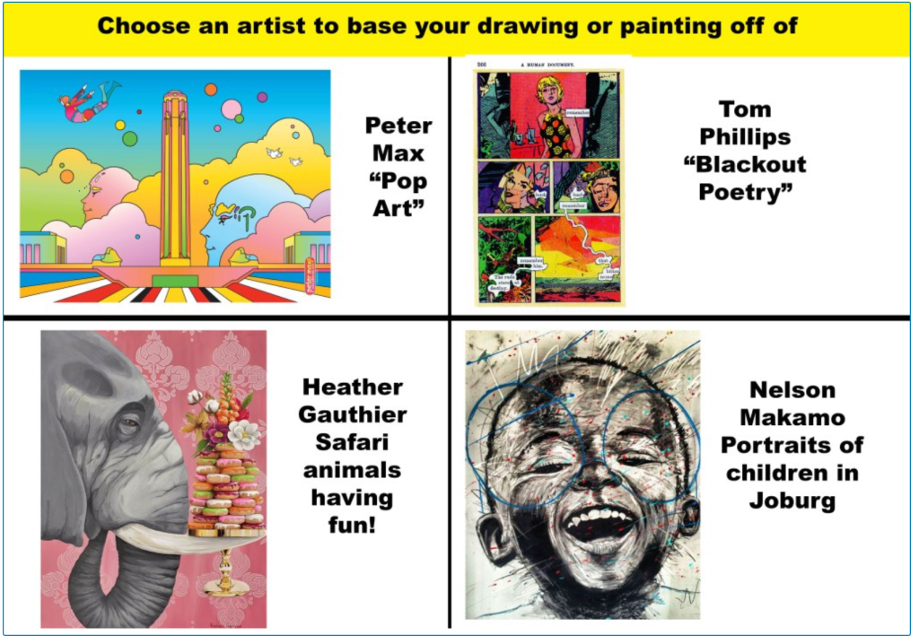 In this class, students are given plenty of “Choice Boards” which give them options for what they can create. Within the 4 choices on my boards, I provide opportunities for differentiation, so that the students who desire the most challenging artists and techniques can be challenged, while those who struggle can also find success. Below is one such Choice Board. Students must have 3 things in whatever they create: 1. Artist influence. 2. Communication of a concept/context 3. Creativity.