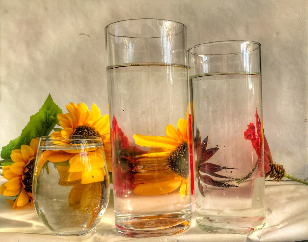 Using different heights of glassware and levels of water, students were asked to photograph objects behind the glassware, as they “refracted and reflected.”